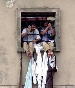 Inmates in the Carandiru Prison, Latin America’s largest, use a celular phone during a 2001 rebellion in Sao Paulo, Brazil. The uprising was part of a state-wide prison riot of about 20,000 inmates in 29 jails. Sixteen prisoners were killed and and 8,000 others taken hostage during the rebellion which authorities said was coordinated by pre-paid cell phones smuggled into jails. (AP photo) |