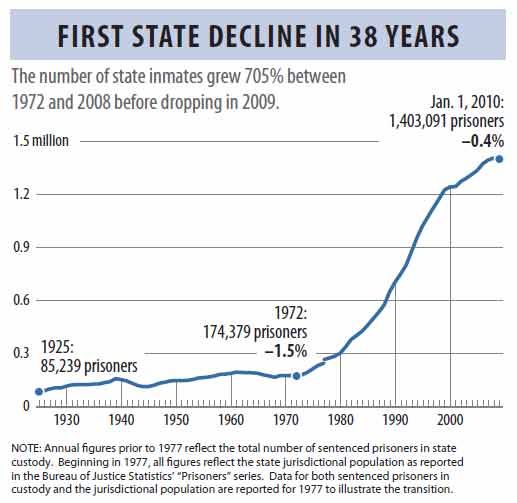 As of January 1, there were 1,403,091 people in state prisons, which is 5,739 fewer than a year earlier, said the survey, titled “Prison Count 2010,” a drop of 0.4 percent.